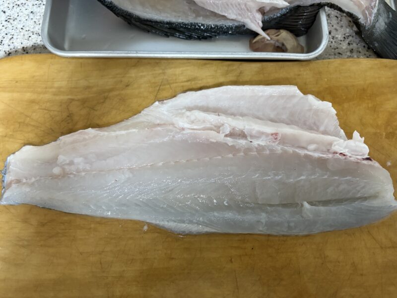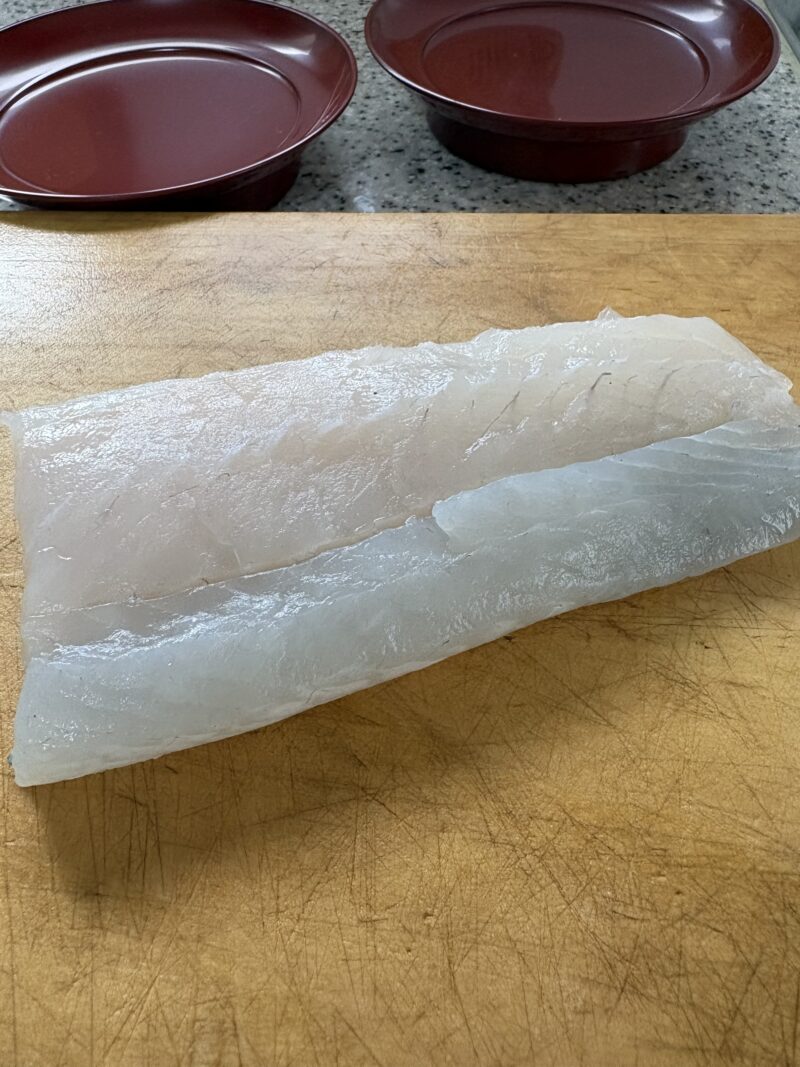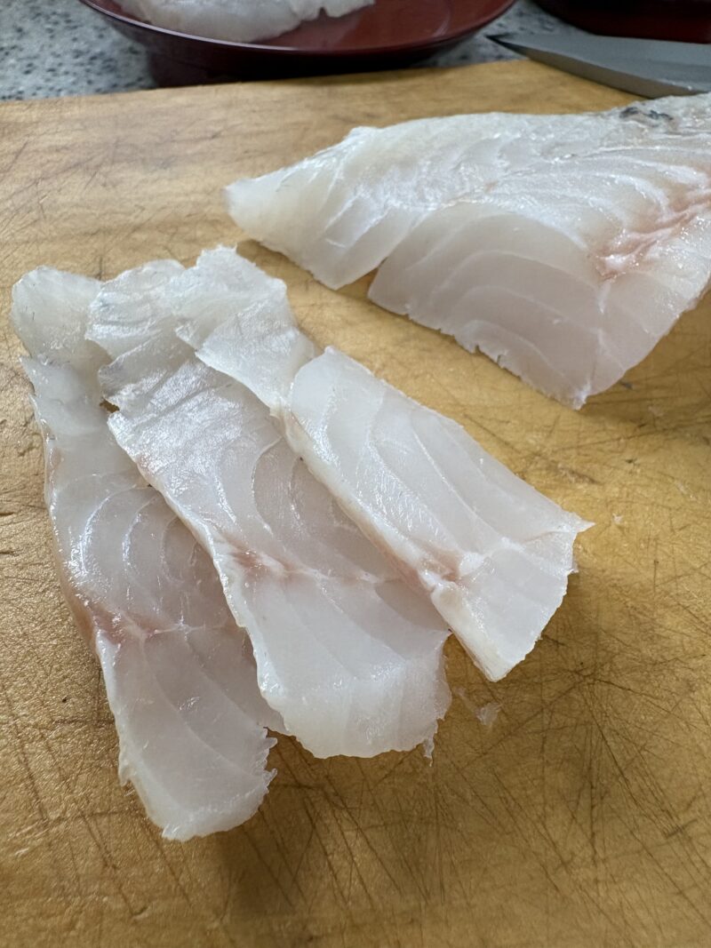 ①ヒラスズキを下処理して、2mm厚さに切る。
