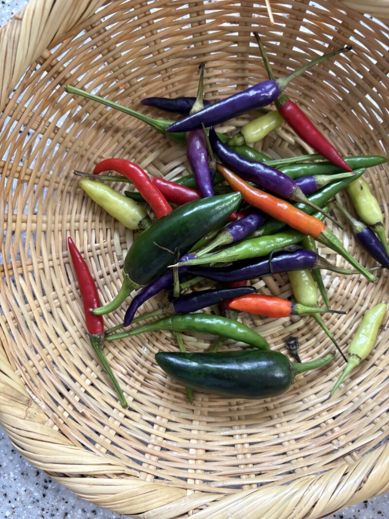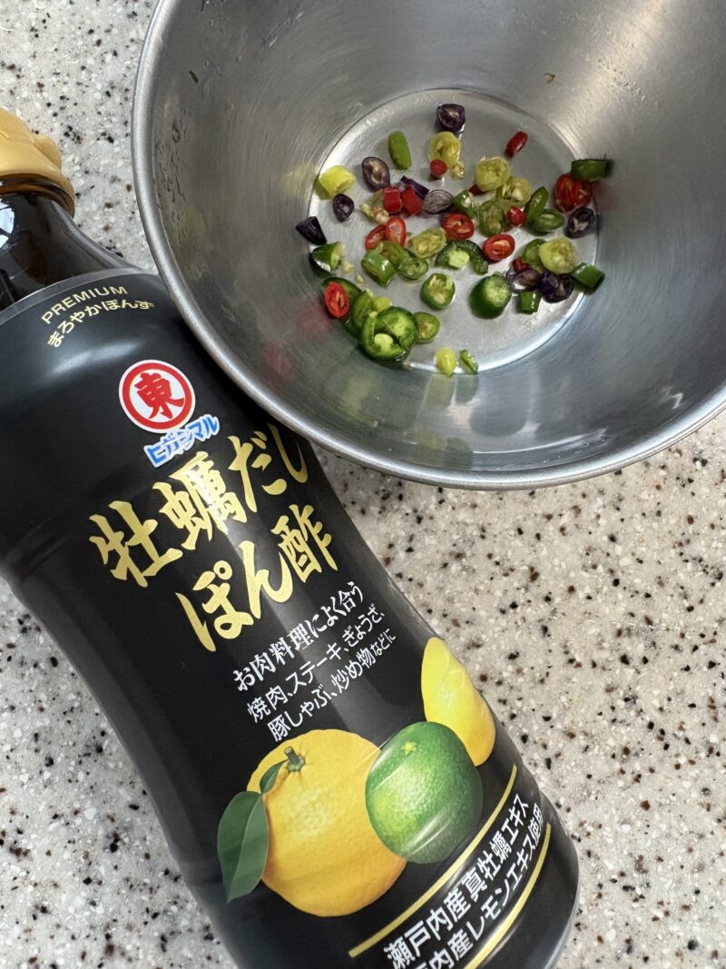 色々な唐辛子をゲットしました!ポン酢はヒガシマルの牡蠣だしポン酢を使用。