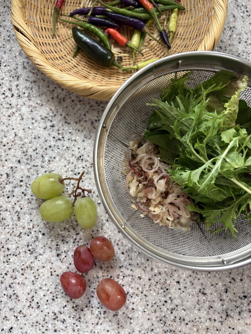③皿に3cm長さに切った水菜・薄切りのみょうが・ヒラスズキの刺身を盛り、<ぶどうのスパイシーポン酢>をかける。