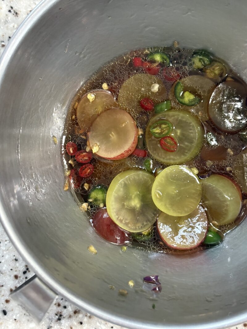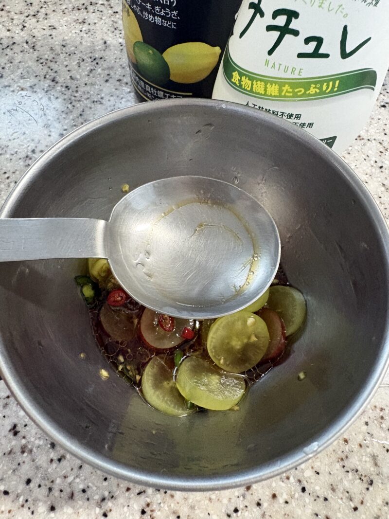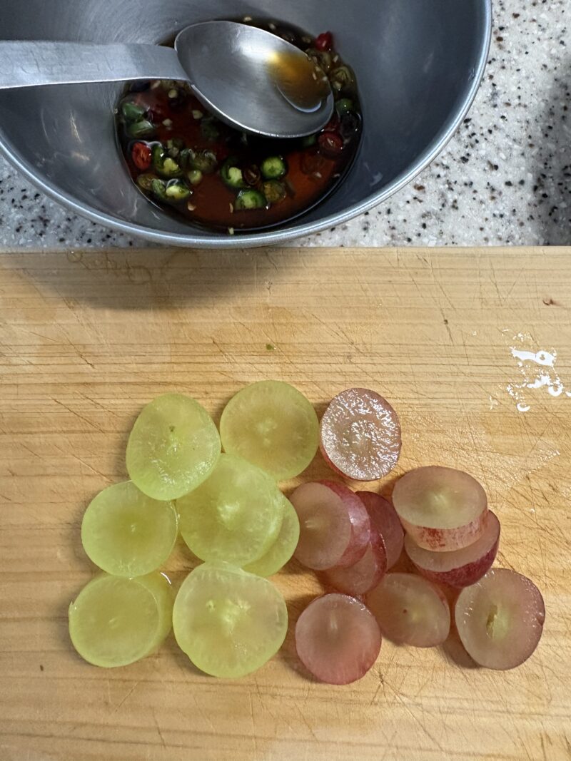 ②<ぶどうスパイシーポン酢>を作る。ボウルに、小口切りにした生唐辛子・ポン酢・薄切りにしたぶどうを入れる。