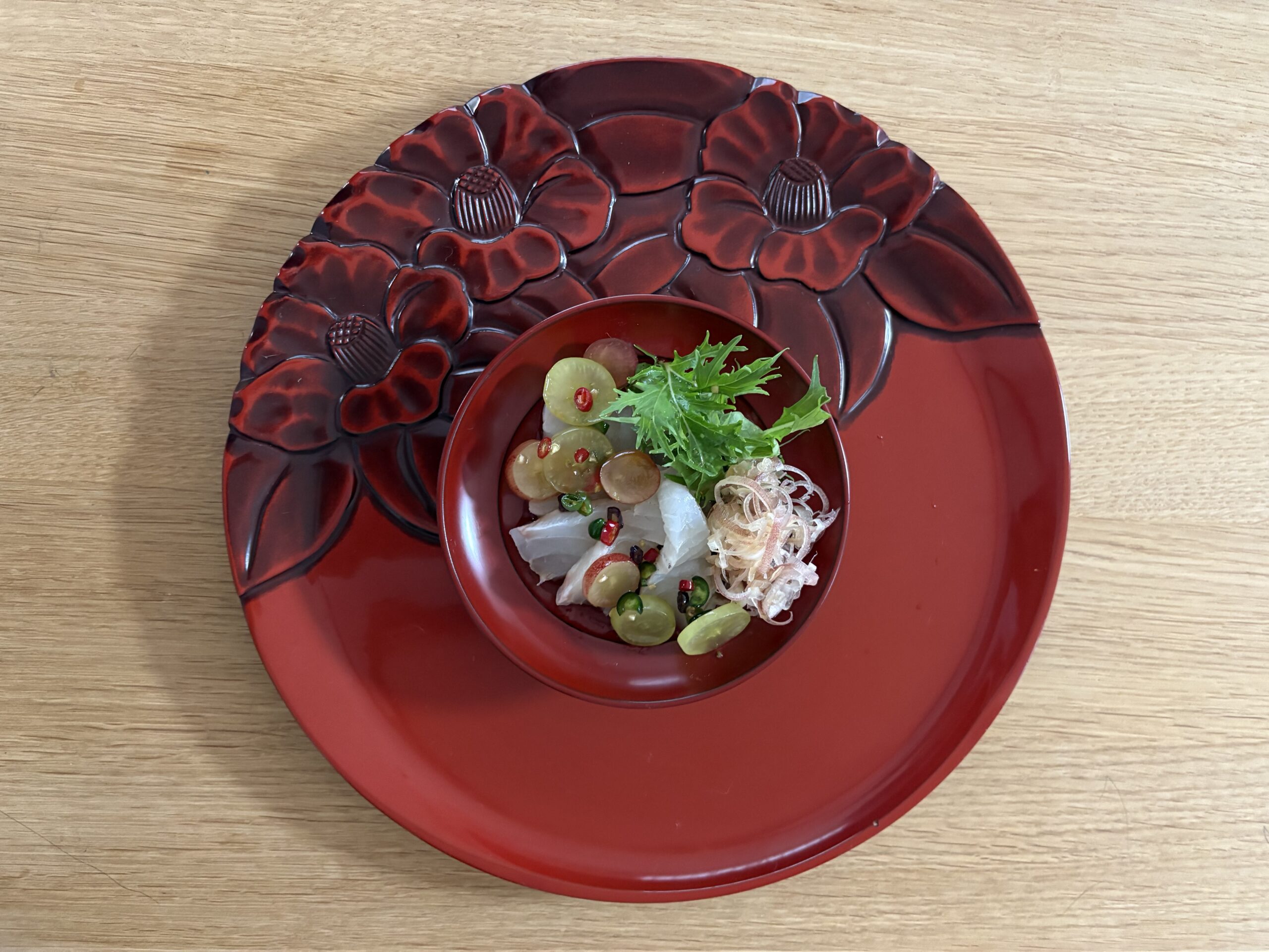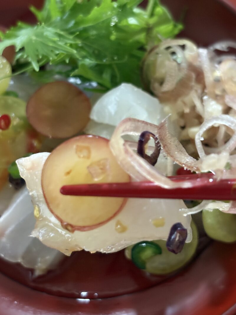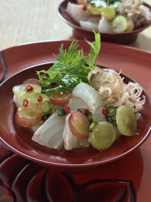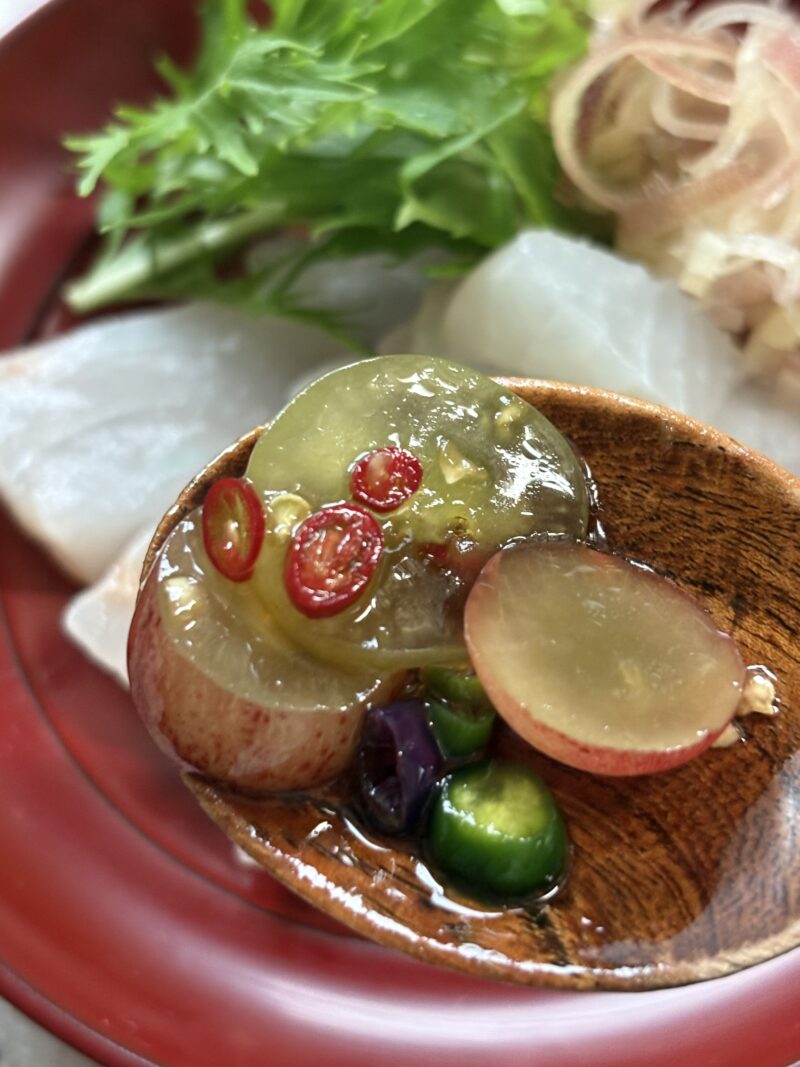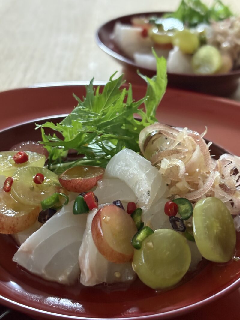 今回はぶどうの甘さとポン酢の酸味が、ヒラスズキの淡白さにドンピシャ!