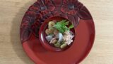 揚げたカサゴの外皮はパリパリの食感、身はふっくら。旬の夏野菜と一緒に、だしに浸した一品です。温かくても、冷やしでもオススメです!
