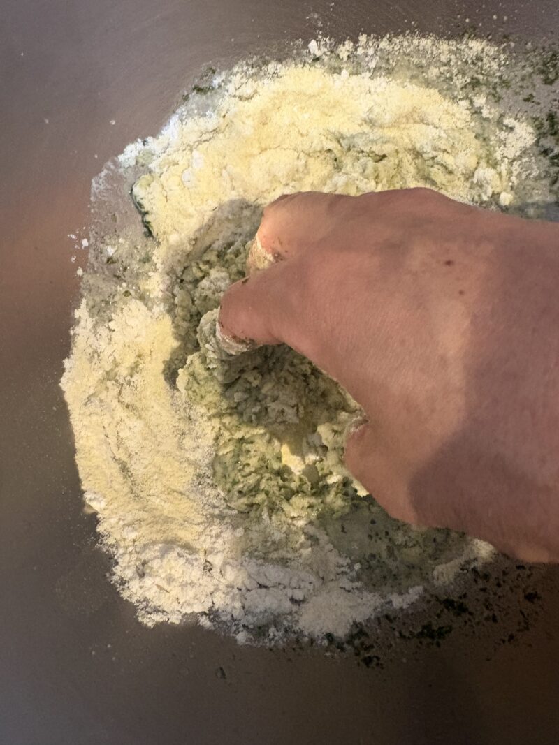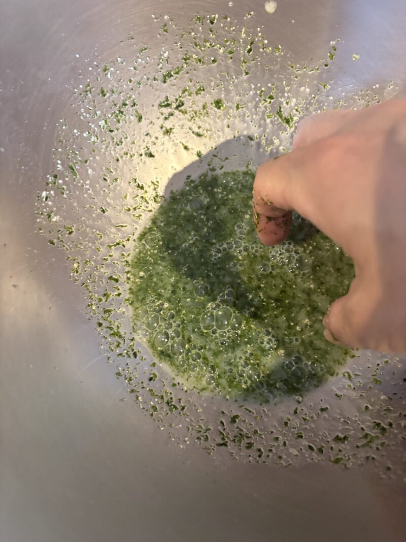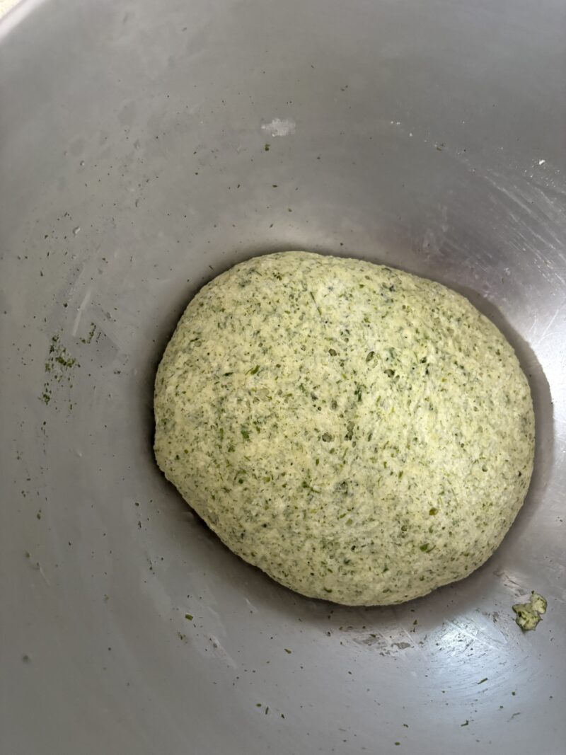 ①ボウルにイースト・水・藻塩・青のりを合わせよく混ぜる。全体がなじんだら、強力粉とデュラムセモリナ粉を入れてよく混ぜる。