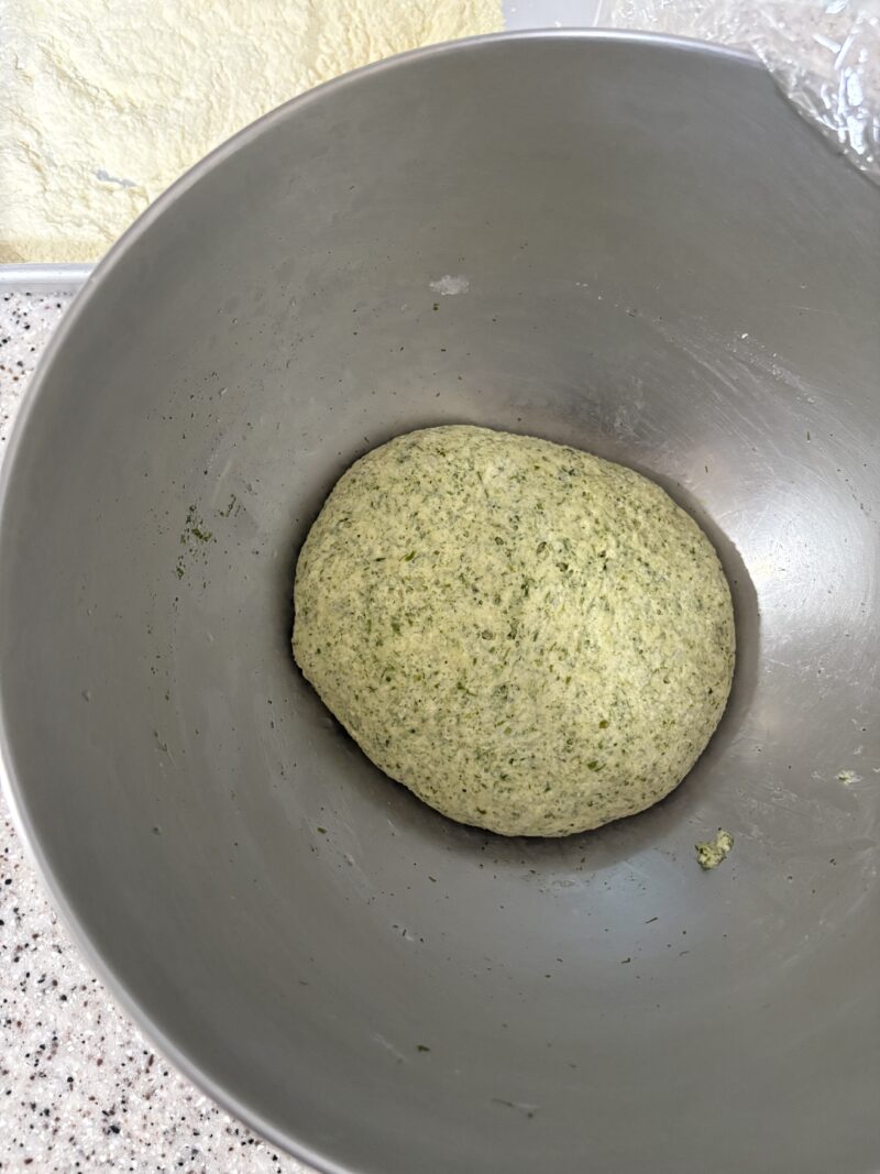 ②生地が一つにまとまり、表面が滑らかになったらラップをかけて1時間くらい室温で2倍くらいに膨らむまで発酵させる。