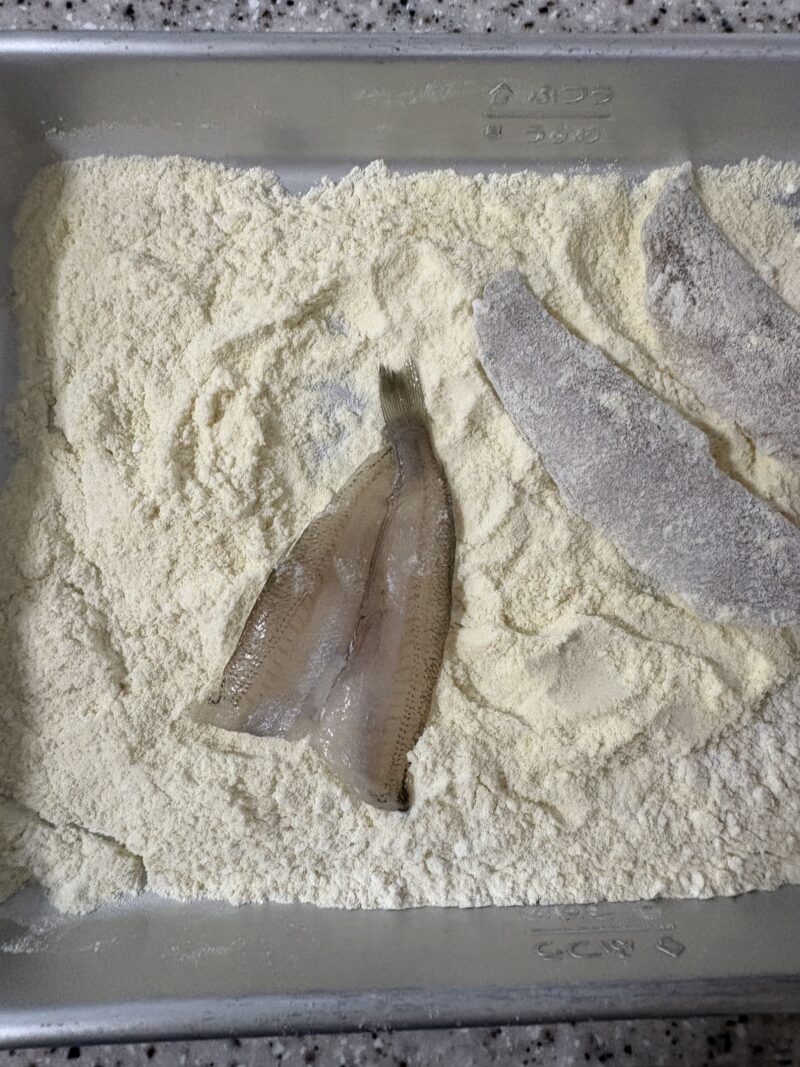 ②下処理したシロギスに粉をまんべんなくまぶす。余分な粉は、はたいておく。
