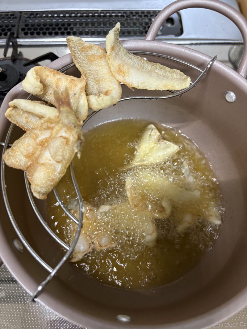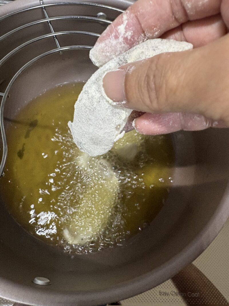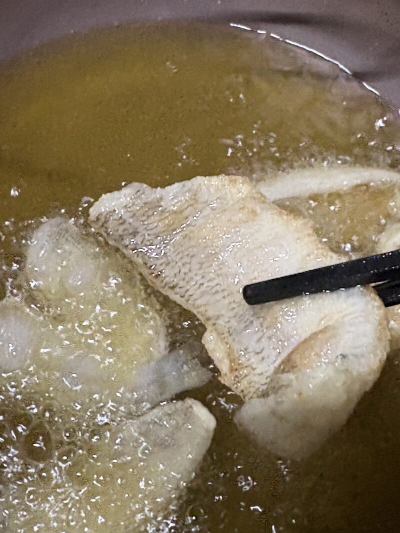 ③鍋に3cmほどの米油を入れ170℃に熱し、②を両面こんがり色づくまで揚げる。