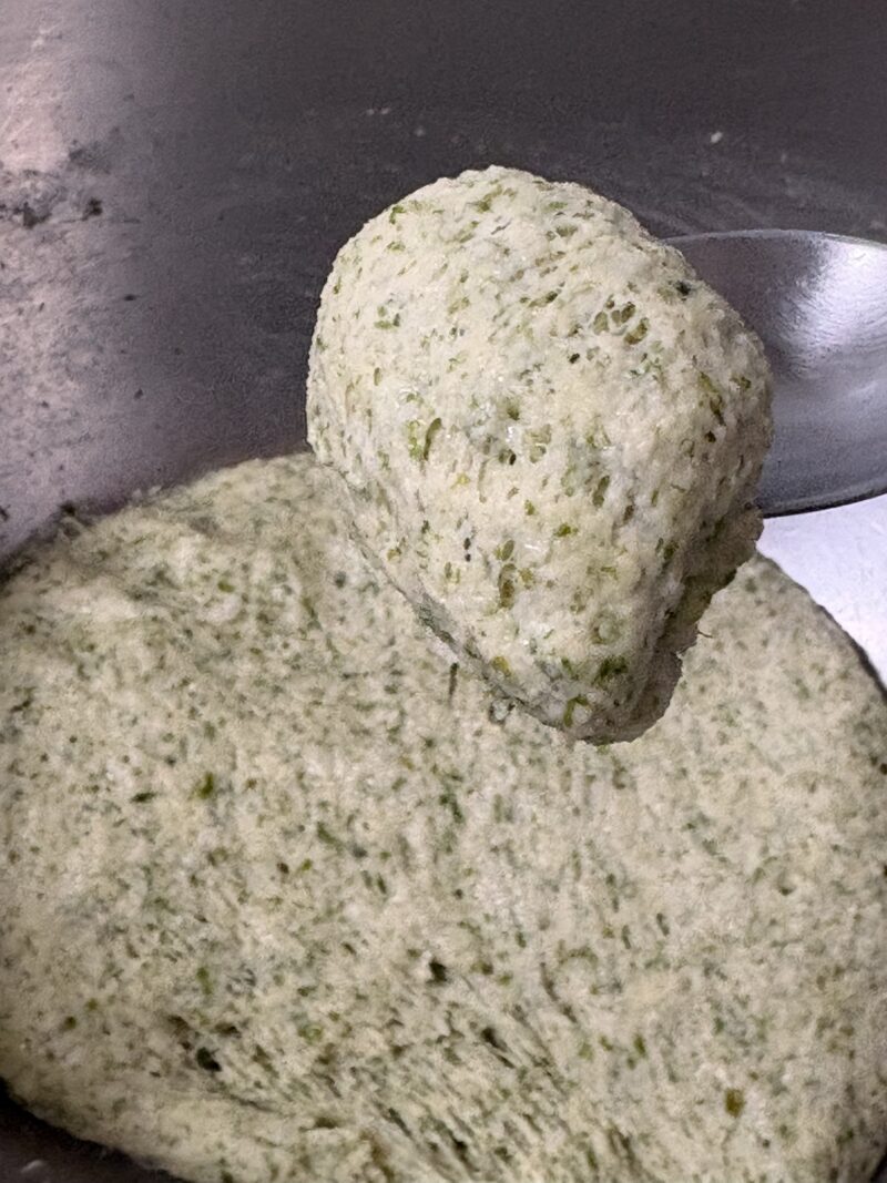 青のりを練り込んだ発酵生地を丸めて揚げた小さなパンです。