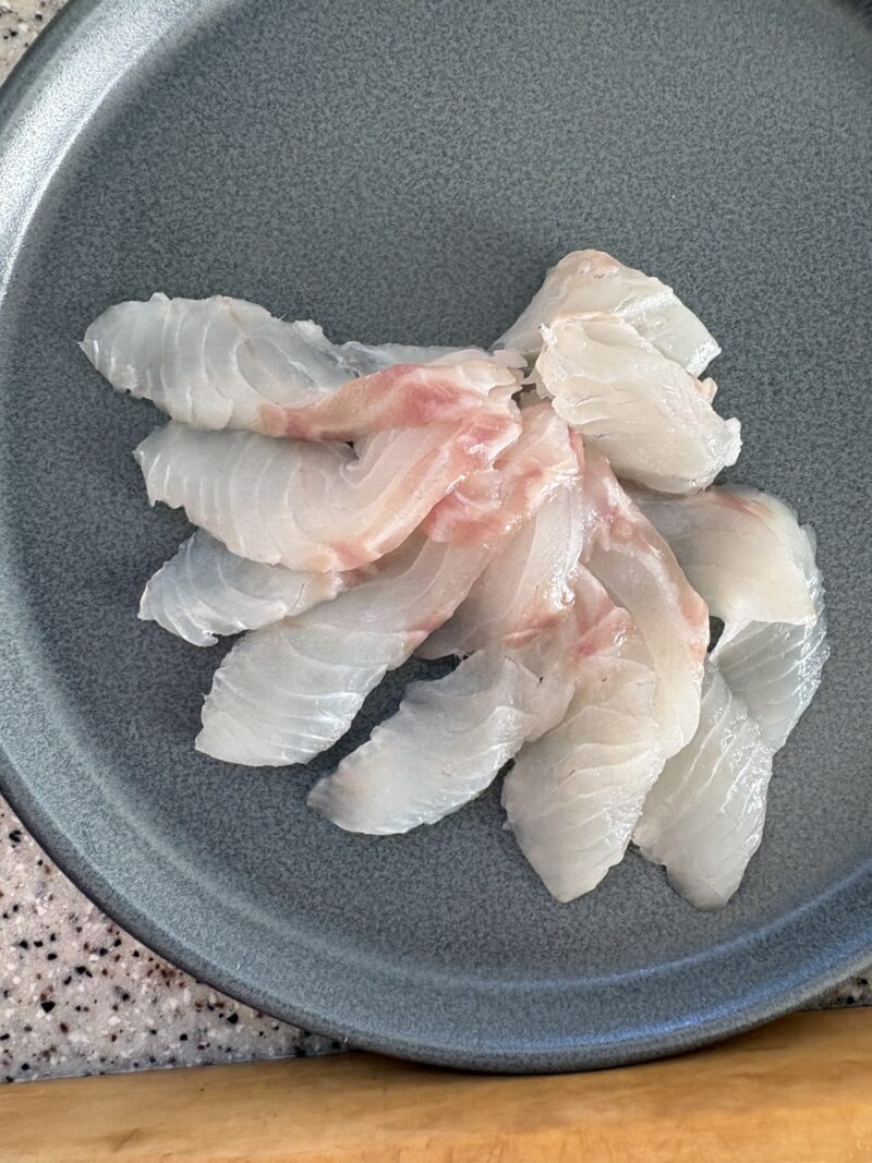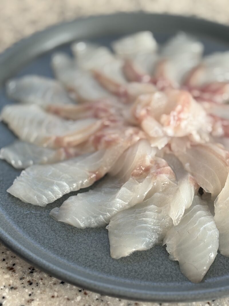 ヒラスズキは、鮮度を味わう生で食べるカルパッチョ。