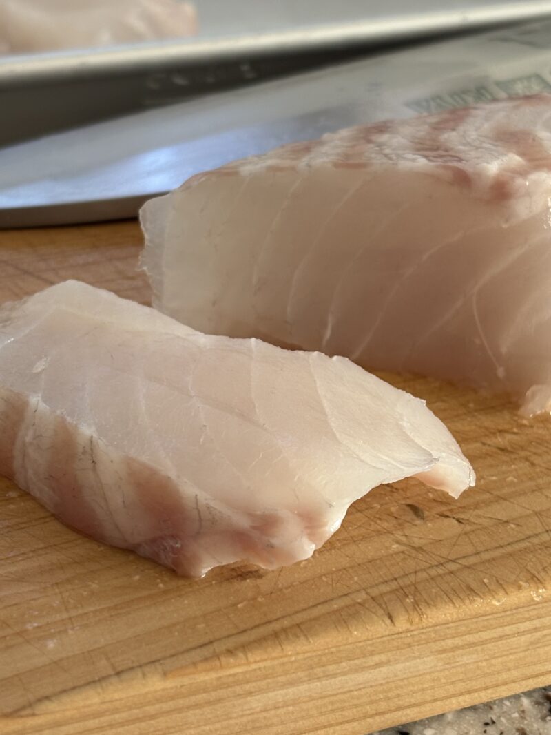 ①ヒラスズキは三枚におろし、皮をとる。