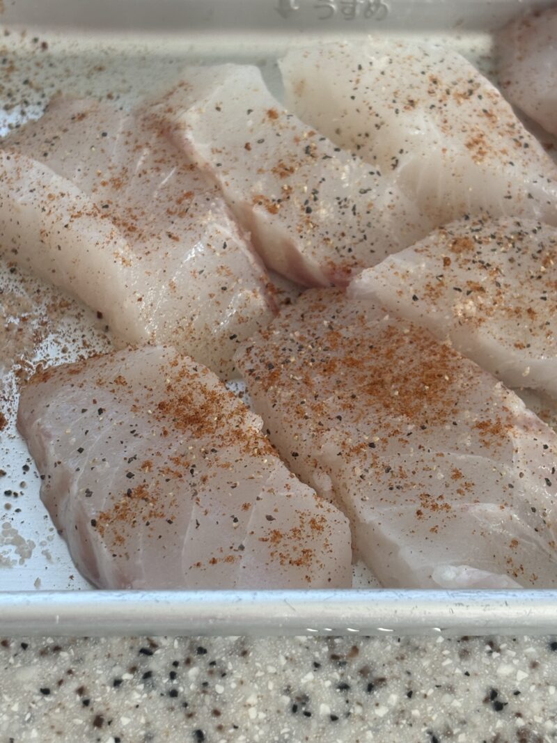 ①マルスズキの皮を取り、切り身にして藻塩を振り約10分おいて水気を拭く。黒胡椒・パプリカパウダーを振る。