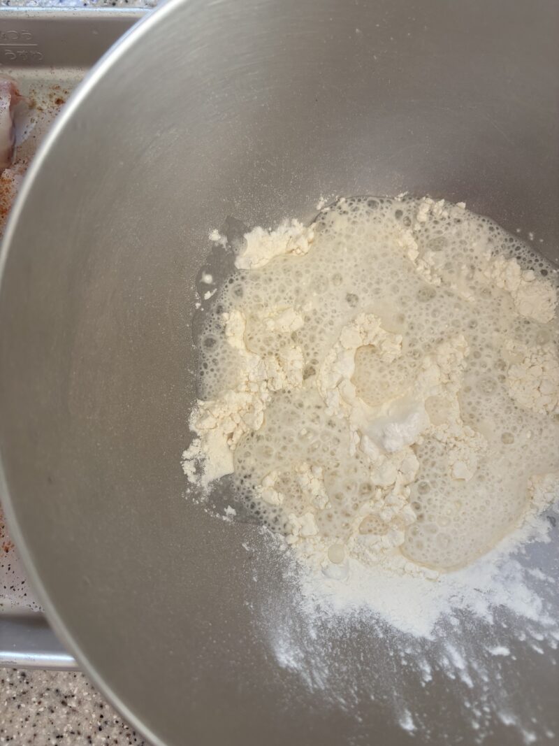 ②衣を作る。ボウルに薄力粉・片栗粉・藻塩を入れ、冷えた炭酸水を加えてさっくり混ぜる。