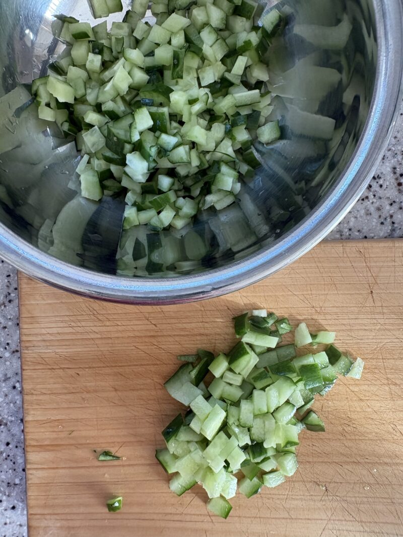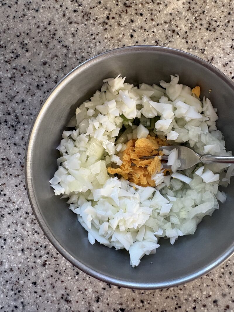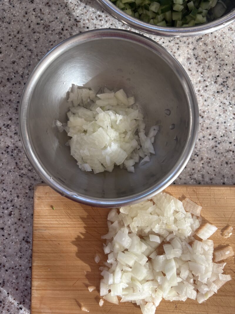 ④野菜のタルタルソースを作る。きゅうり・玉ねぎはみじん切りにする。茹で卵は白身・黄身の部分を分けて、白身はみじん切り、黄身はマッシュして細かくする。