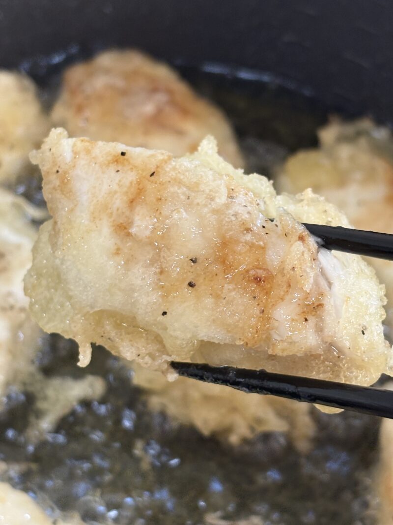 ③170〜180℃の油で、衣を纏わせたマルスズキを揚げる。表面がキツネ色になったら取り出す。