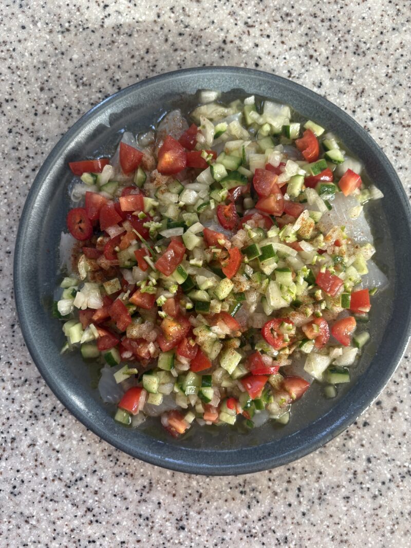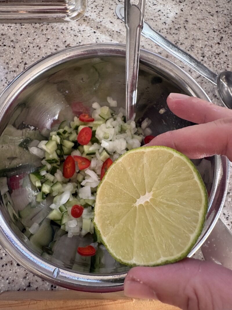 ③ミニトマトは1/4等分・きゅうり・玉ねぎ・赤唐辛子は細かく刻みボウルに入れ、ライムを絞る。